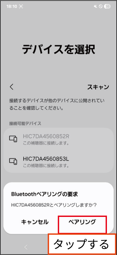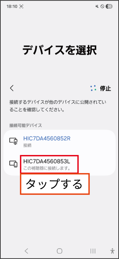 6「接続可能デバイス」に登録する補聴器が表示されていることを確認してタップします。